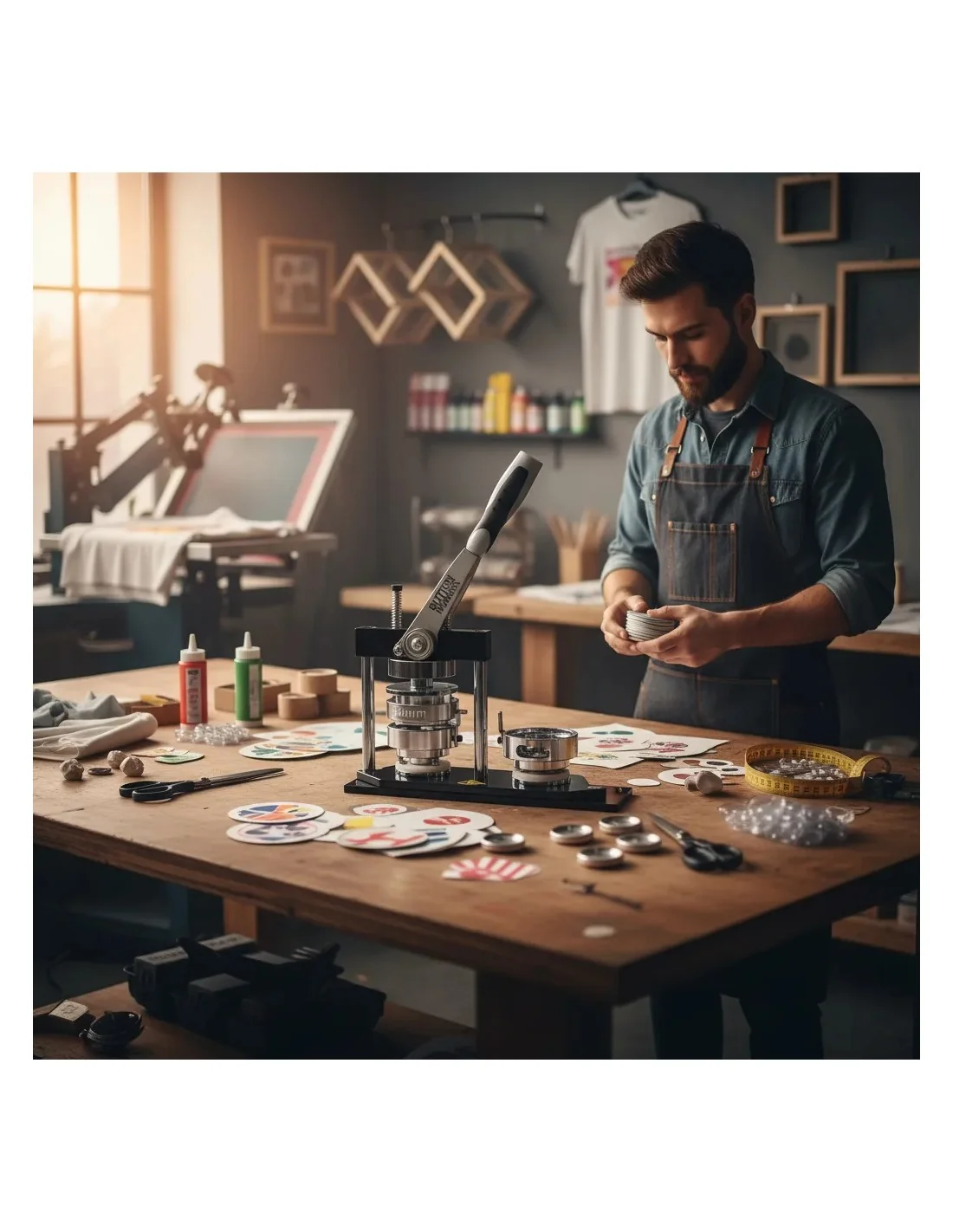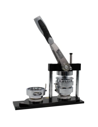 La máquina Button Maker 37 mm es un equipo manual diseñado para fabricar chapitas, imanes, espejos, llaveros o identificadores en formato circular de 37 mm de diámetro.