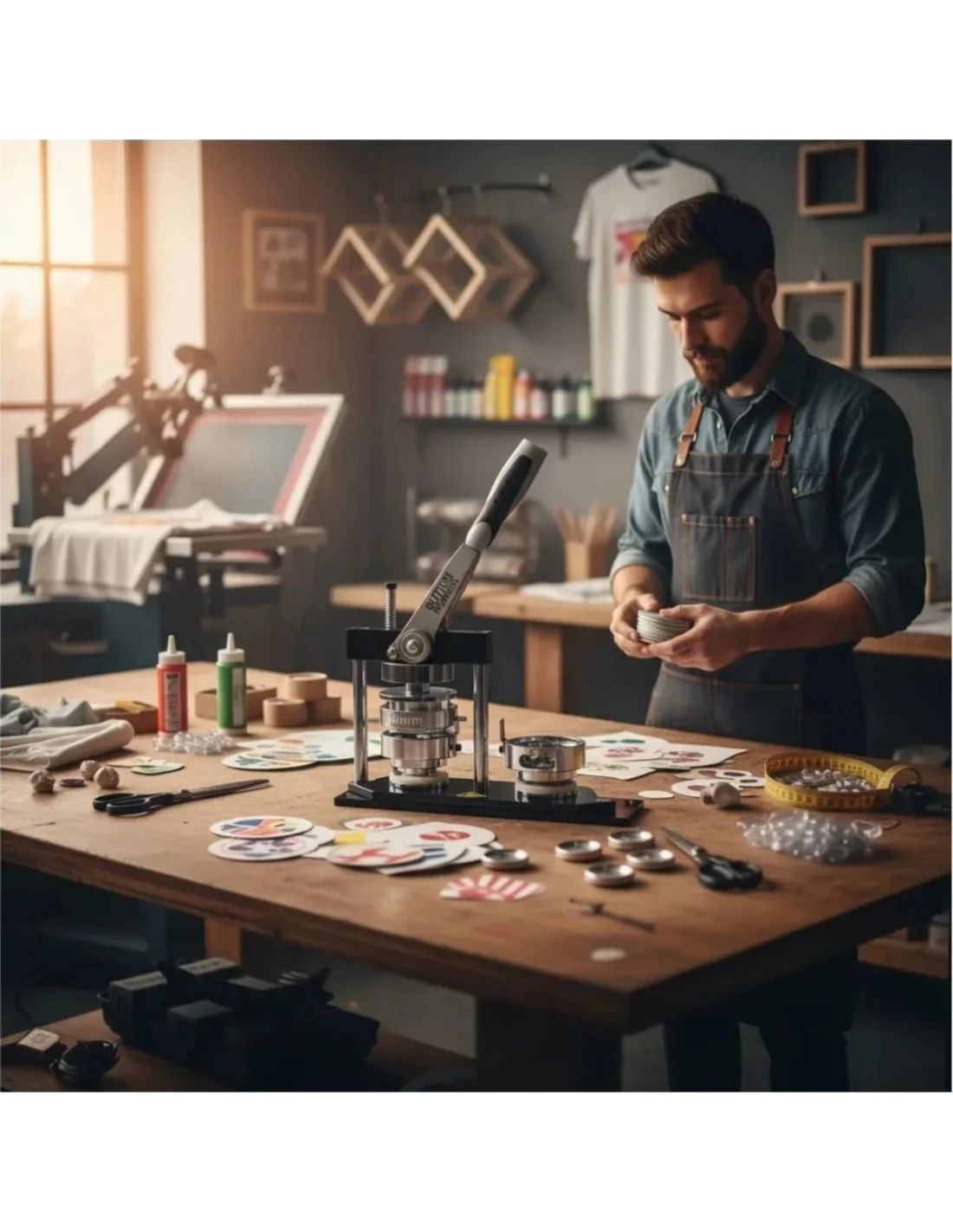 La máquina de chapitas de 58 mm está orientada a la producción de chapas grandes (3 pulgadas), ideales para exhibición, campañas políticas o merchandising premium. Combina estructura robusta con precisión mecánica para producción profesional.