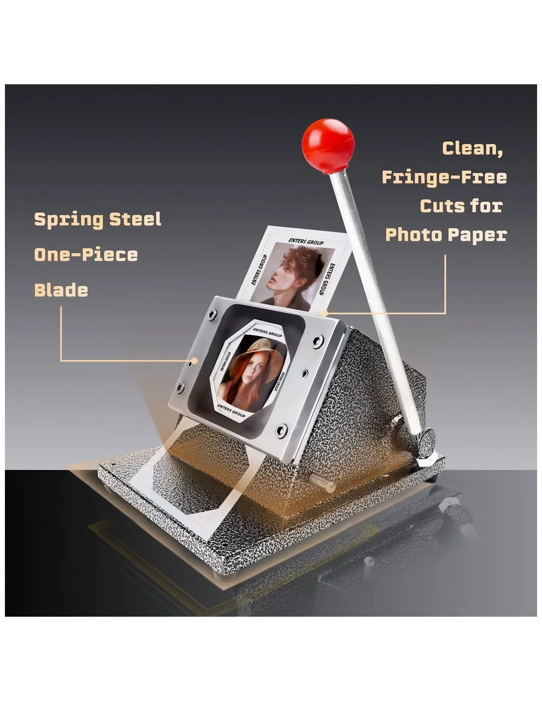 El kit es “todo en uno”: incluye la prensa manual, un cortador de papel específico para recortar las imágenes o fotos a 5 × 5 cm y consumibles para empezar inmediatamente. La máquina viene con aproximadamente 100 carcasas frontales de hojalata, 100 cubiertas traseras de plástico, 100 respaldos magnéticos, 100 películas protectoras y 100 papeles en blanco. También añade una plantilla de plástico para centrar la imagen, llaves de ajuste y un manual de instrucciones. Estos materiales permiten fabricar un centenar de imanes sin compras adicionales.