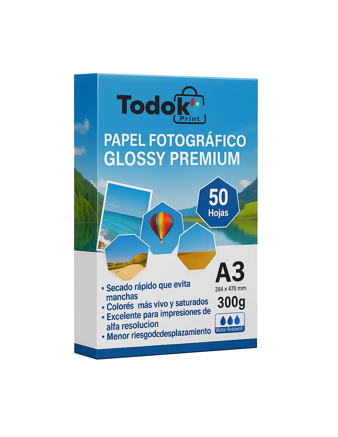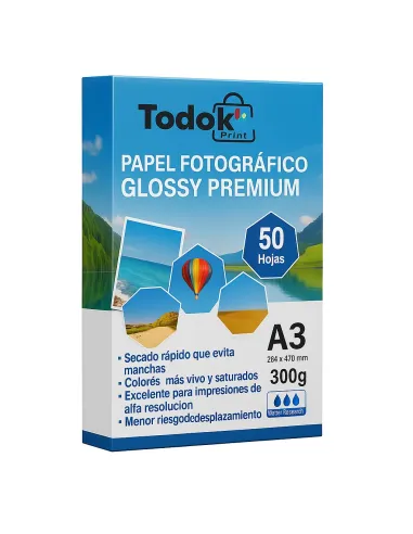 Descripción general: Papel fotográfico de alta calidad con acabado glossy, diseñado para imprimir fotografías y gráficos con colores vivos y detalles nítidos. Ideal para impresión doméstica o en pequeños estudios. Paquete de 50 hojas tamaño A3 (297 × 420 mm) con gramaje de 300 g/m².