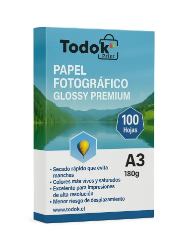 Descripción general: Papel fotográfico de alta calidad con acabado gloss, diseñado para imprimir fotografías y gráficos con colores vivos y detalles nítidos. Ideal para impresión doméstica o en pequeños estudios. Paquete de 100 hojas tamaño A3 (297 × 420 mm) con gramaje de 180 g/m².