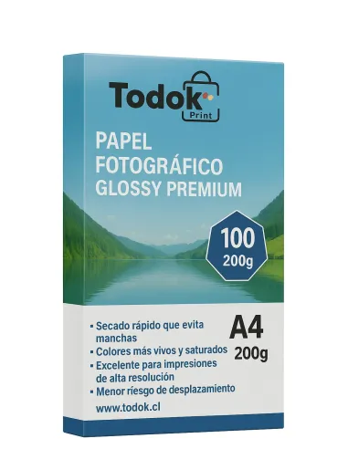 Descripción general: Papel fotográfico de alta calidad con acabado gloss, diseñado para imprimir fotografías y gráficos con colores vivos y detalles nítidos. Ideal para impresión doméstica o en pequeños estudios. Paquete de 100 hojas tamaño A4 (210 × 297 mm) con gramaje de 200 g/m².